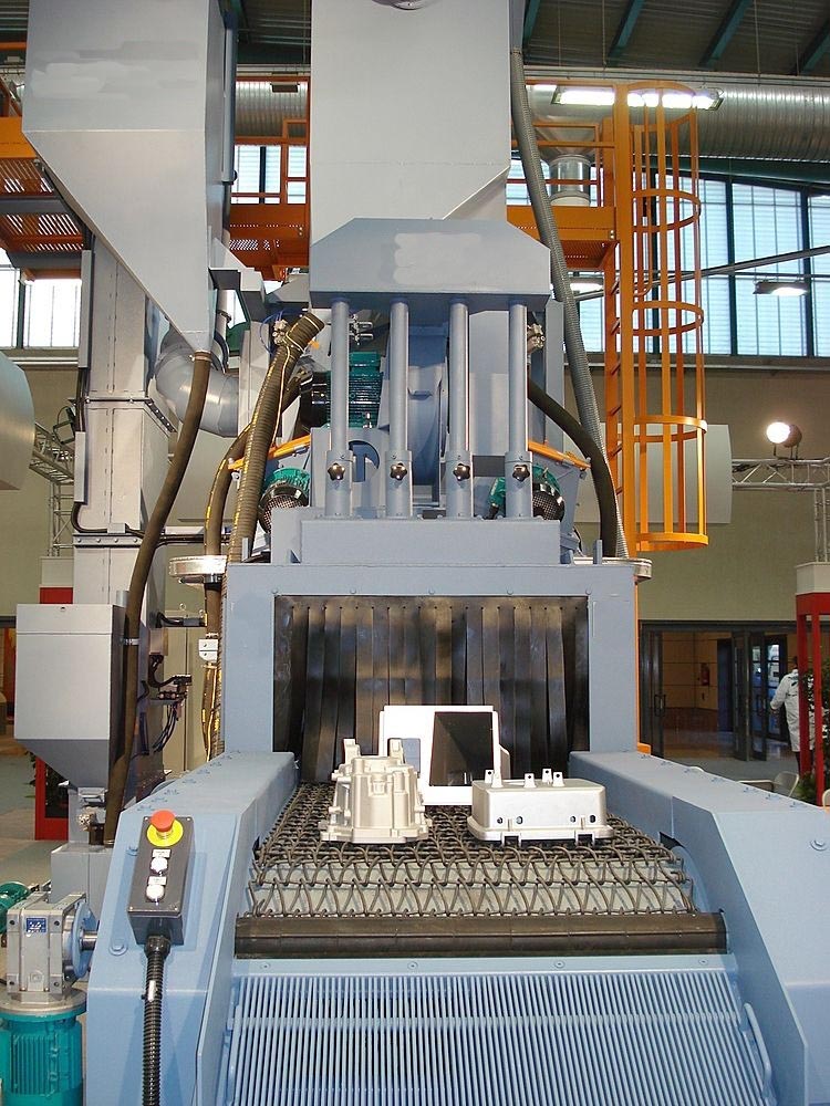 2.网带式抛丸机采用 4 台 Q0400 高抛射速度轴座离心式抛丸器,显著提高清理效率、获得满意的清理质量且有效避免弹丸阻塞烧毁电机的情况发生。