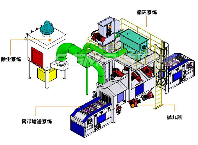 网带式抛丸清理机是根据用户要求而设计制作的一种新型专用设备, 是一种清理碟状、片状、怕碰撞铸件、机体、结构件的功能抛丸机设备。